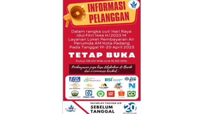 Metro Padang | Bapak/Ibu Pelanggan Perumda Air Minum Kota Padang, Selama libur cuti lebaran Idul Fitri 1444 H/2023 M, loket pembayaran tagihan air Perumda AM Kota Padang TETAP BUKA pada tanggal 19-20 April 2023 pukul 08.00 wib s/d 15.00 wib.