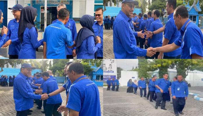 Setelah apel, Afrizal Kuning dan Andri Satria langsung mendampingi Hendra, untuk saling bermaafan dengan berjabatan tangan secara langsung kepada seluruh pegawai peserta apel pagi. (mp)