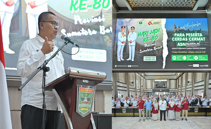 metropadang.com – Sekretaris Daerah Provinsi Sumatera Barat, Arry Yuswandi, membuka secara resmi kegiatan Cerdas Cermat BerAKHLAK dalam rangka menyambut Hari Ulang Tahun (HUT) Sumatera Barat ke-80. Acara berlangsung di Aula Kantor Gubernur, Rabu (24/9/2025), dengan mengusung tema “Cerdas BerAKHLAK, Melayani Sepenuh Hati”.