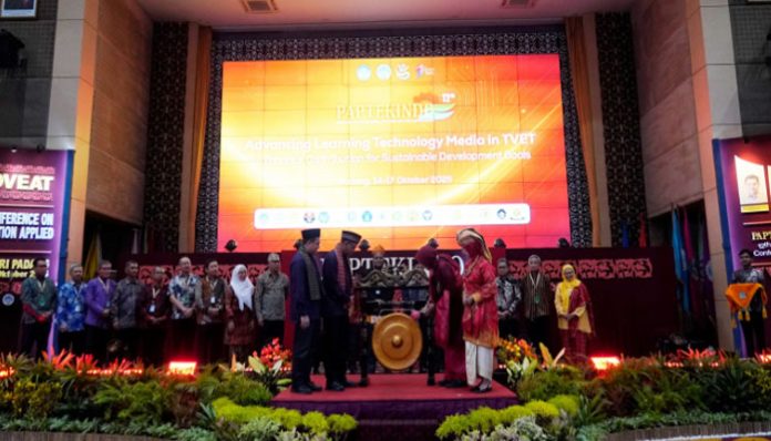 Rektor UNP, Prof. Dr. Krismadinata, Ph.D., yang secara resmi membuka kegiatan PAPTEKINDO 2025 sekaligus menandai dimulainya rangkaian Dies Natalis ke-71 UNP. Dalam sambutannya, Rektor UNP mengajak seluruh peserta untuk memperkuat jejaring dan kolaborasi lintas kampus guna mengangkat kearifan lokal sebagai sumber inovasi vokasi.