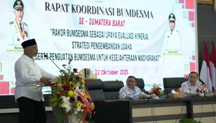 metropadang.com – Pemerintah Provinsi Sumatera Barat menggelar Rapat Koordinasi (Rakor) Badan Usaha Milik Desa Bersama (BUMDesma) se-Sumatera Barat di Auditorium Gubernuran, Rabu (22/10/2025). Kegiatan ini diikuti sekitar 120 peserta yang merupakan perwakilan BUMDesma dari berbagai kabupaten dan kota di Sumatera Barat.