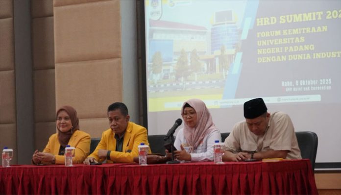 metropadang.com – Universitas Negeri Padang (UNP) melalui UPT Pengembangan Karir dan Kewirausahaan (UPT PKK) menggelar Employee Meeting 2025 atau HRD Summit bersama 35 perusahaan dan instansi di Sumatera Barat. Kegiatan yang berlangsung di UNP Hotel and Convention, Rabu (8/10), ini menjadi ajang perdana yang mempertemukan langsung dunia pendidikan dengan dunia industri untuk memperluas jejaring dan membuka peluang kerja bagi alumni UNP.