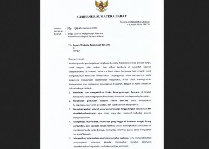 Usai penetapan status tanggap darurat bencana alam, Pemerintah Provinsi Sumatera Barat (Pemprov Sumbar) perkuat upaya kesiapsiagaan dan percepatan penanganan dampak bencana alam di sejumlah wilayah terdampak dengan mengeluarkan Surat Gubernur nomor : 360/756.2/Kesbangpol/2025 tentang Siaga Darurat Menghadapi Bencana Hidrometeorologi di Sumbar. Surat tersebut, ditujukan kepada seluruh Bupati/Walikota daerah terdampak.