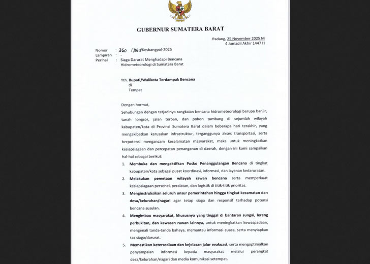 “Adanya surat ini bukan berarti daerah tidak bekerja, ini sifatnya hanya mengingatkan. Untuk optimalisasi kesiapsiagaan dan penanganan dampak bencana,”jelas Sekdaprov Sumbar, Arry Yuswandi di Padang, Rabu (26/11/2025).