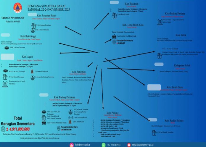 “Perkiraan kerugian sementara sekitar Rp 4,9 miliar lebih. Ini baru perkiraan awal. Tim di lapangan terus melakukan verifikasi agar kita mendapatkan gambaran menyeluruh terkait dampak bencana dan kebutuhan intervensi pemulihan,” ujar Arry di Padang, Selasa (25/11/2025).