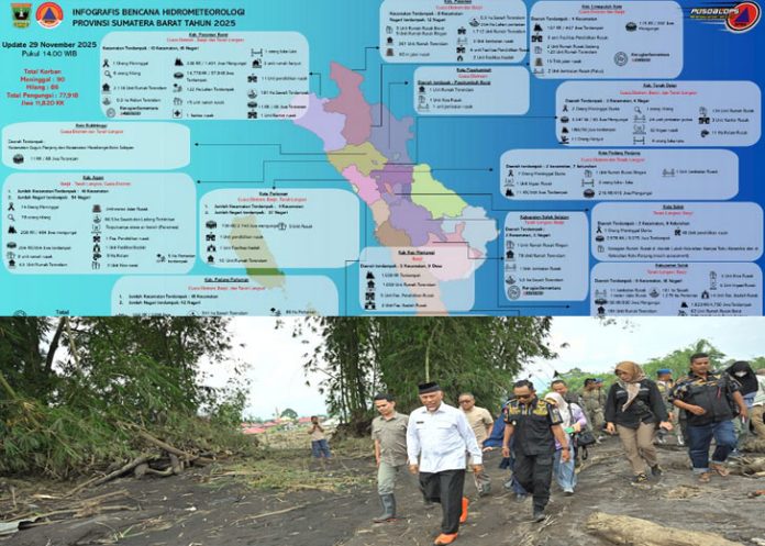 metropadang.com – Pemerintah Provinsi Sumatera Barat (Pemprov Sumbar) melalui Pusdalops BPBD kembali merilis pembaruan data korban bencana hidrometeorologi yang melanda sejumlah daerah sejak 21 November 2025. Hingga Sabtu (29/11) pukul 14.00 WIB, tercatat 90 orang meninggal dunia dan 86 orang masih dinyatakan hilang.