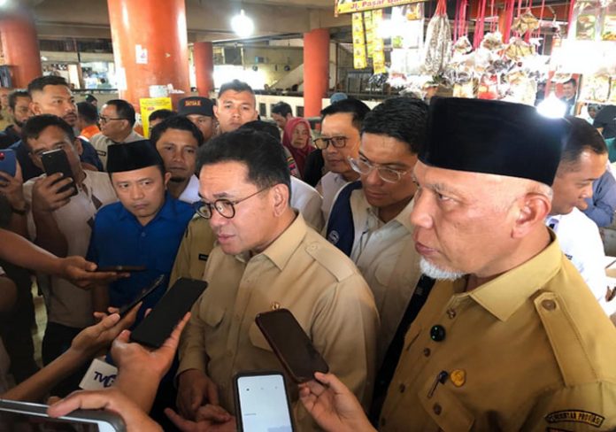 metropadang.com – Menteri Perdagangan (Mendag) RI, Budi Santoso bersama Gubernur Sumatera Barat (Sumbar), Mahyeldi Ansharullah meninjau pergerakan harga kebutuhan pokok di Pasar Raya Padang, Selasa (18/11/2025). Kunjungan ini menjadi bagian dari persiapan menghadapi Natal dan Tahun Baru (Nataru), sekaligus memastikan rantai pasok pangan tetap terjaga.