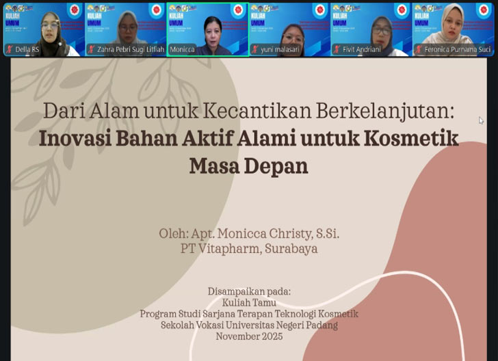 metropadang.com – Program Studi Teknologi Kosmetik, Sekolah Vokasi, Universitas Negeri Padang (UNP) mengadakan kuliah umum bertajuk “Dari Alam untuk Kecantikan Berkelanjutan: Inovasi Bahan Aktif Alami untuk Kosmetik Masa Depan” secara berani melalui Zoom Meeting, Senin (3/11). Kegiatan ini menghadirkan narasumber dari PT. Vitapharm (Viva Kosmetik), yaitu apt. Monicca Christy, S.Si, yang menjabat sebagai Manajer R&D di perusahaan tersebut.