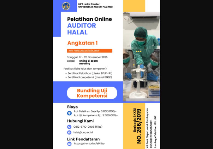 metropadang.com – UPT Halal Center Universitas Negeri Padang (UNP) telah memulai Pelatihan Auditor Halal perdana secara online. Kegiatan ini diselenggarakan tak lama setelah UPT Halal Center UNP menyelenggarakan Pelatihan Penyelia Halal pada akhir November lalu. Pelatihan Auditor Halal ini berlangsung intensif selama empat hari penuh, mulai dari Senin, 17 November hingga Kamis, 20 November 2025.