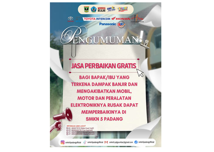 metropadang.com – Dinas Pendidikan Provinsi Sumatera Barat (Sumbar) melalui SMKN 5 Padang membuka layanan jasa perbaikan gratis bagi masyarakat yang terdampak bencana banjir yang melanda sejumlah wilayah di Kota Padang dan sekitarnya. Jenis layanan yang diberikan mulai dari perbaikan kendaraan roda empat , roda dua dan berbagai peralatan elektronik.