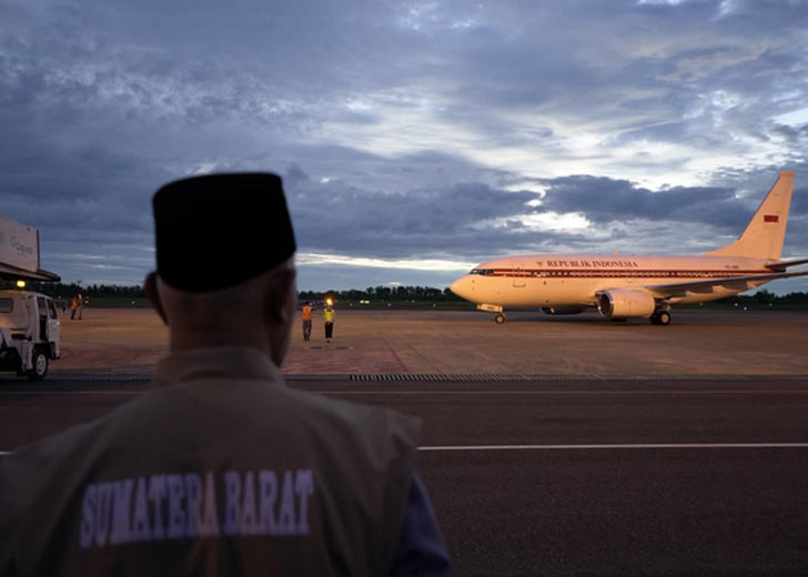 Presiden Prabowo tiba di BIM menggunakan pesawat kepresidenan PK-GIG sekitar pukul 18.31 WIB. Setibanya di Sumbar, Presiden tampak mengenakan baju safari berwarna cokelat, sebelum melanjutkan agenda kunjungan kerja.