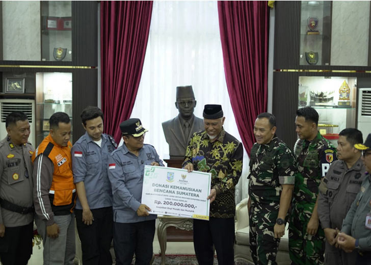 Bantuan yang diserahkan langsung Walikota Jambi, Dr. Maulana bersama Wakil Walikota Diza Aljosha Hazrin dan jajaran Forkopimda, diterima oleh Gubernur Sumbar Mahyeldi Ansharullahdi Istana Gubernur Sumbar, Kamis (11/12/2025).