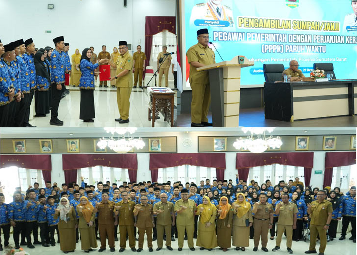 metropadang.com – Sekretaris Daerah Provinsi Sumatera Barat, Arry Yuswandi menyerahkan Surat Keputusan (SK) pengangkatan kepada 117 tenaga honorer Pemerintah Provinsi Sumatera Barat (Pemprov Sumbar) yang resmi berstatus Pegawai Pemerintah dengan Perjanjian Kerja (PPPK) Paruh Waktu. Penyerahan SK tersebut dirangkaikan dengan pengambilan sumpah dan janji PPPK yang digelar di Auditorium Gubernuran, Senin (29/12/2025).