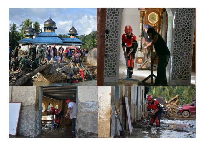 “Mengingat waktu terbatas, pembersihan masjid kita dahulukan. Tim bekerja bersama Damkar Agam dan relawan lainnya. Semoga hari ini selesai sehingga warga bisa kembali beribadah,” kata Hendra.