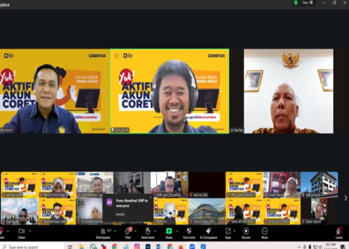 metropadang.com – Universitas Negeri Padang (UNP) bekerja sama dengan Direktorat Jenderal Pajak (DJP) Kantor Wilayah Sumatera Barat menggelar sosialisasi pengaktivasian akun Coretax bagi sivitas akademika UNP secara daring melalui Zoom Meeting, Rabu (24/12/2025).