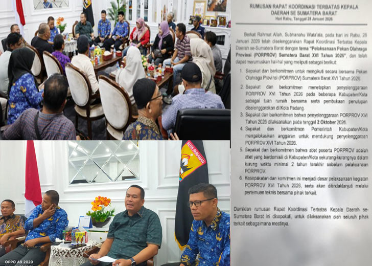 metropadang.com – Pelaksanaan Pekan Olahraga Provinsi (Porpov) Sumatera Barat XVI Tahun 2026 diundur bulan Oktober 2026. Ini merupakan hasil Rapat Koordinasi Terbatas Kepala Daerah se-Sumatera Barat yang dilaksanakan pada Rabu, 28 Januari 2026 kemaren, dan ditandatangani oleh Walikota dan Bupati se-Sumatera Barat bersama Wakil Gubernur Sumatera Barat.