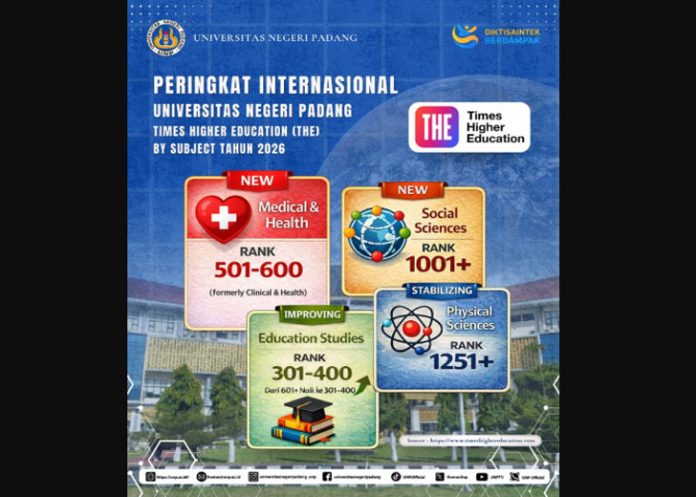 metropadang.com – Capaian yang kemajuan yang diraih Universitas Negeri Padang (UNP) secara kelembagaan semakin menunjukkan hasil positif pada tahun 2026 ini. Hal ini diperoleh dari hasil Perangkingan Times Higher Education (THE) by Subject 2026 yang baru dirilis oleh pihak THE. Sebagai resume, kali ini UNP mendapatkan peringkat pada 4 subjek, yakni: (1) Kedokteran dan Kesehatan (dahulu Klinis dan Kesehatan): 501–600, (2) Ilmu Pendidikan (sebelumnya Pendidikan): 301– 400, dan (3) Ilmu Fisika: 1251+, serta (4) Ilmu Pengetahuan Sosial: 1001+
