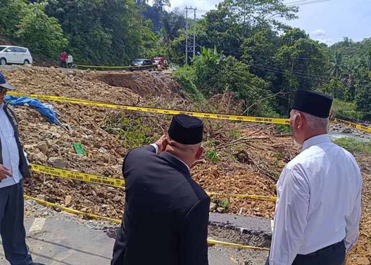 “Ada tiga titik yang mengalami kerusakan cukup parah, dua titik mengalami terban dan satu titik lainnya putus akibat longsoran,” ungkap Mahyeldi saat meninjau lokasi.