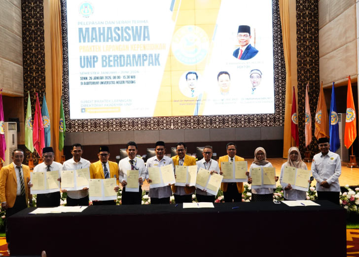 metropadang.com – Universitas Negeri Padang (UNP) melalui Subdit Praktek Lapangan Direktorat Alumni & Kemahasiswaan secara resmi melepas 652 mahasiswa peserta Praktek Lapangan Kependidikan (PLK) periode Januari-Juni 2026 dalam acara pelepasan dan serah terima di Auditorium UNP, Senin (26/1). Acara ini juga dimeriahkan dengan penandatanganan perjanjian kerja sama antara Kanwil Kementerian Agama Provinsi Sumatra Barat dengan delapan fakultas di UNP.