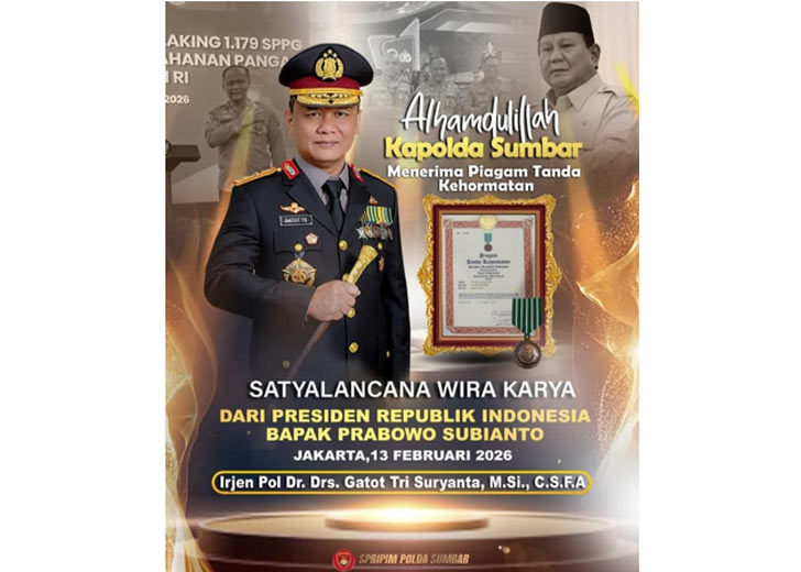metropadang.com – Kapolda Sumatera Barat Irjen Pol Dr. Drs. Gatot Tri Suryanta, M.Si., C.S.F.A resmi menerima Satyalancana Wira Karya dari Presiden Republik Indonesia Prabowo Subianto dalam seremoni kenegaraan di Jakarta, Kamis (13/2/2026). Penghargaan ini menjadi bentuk pengakuan negara atas dedikasi dan kontribusi nyata yang dinilai memberi dampak signifikan bagi masyarakat dan institusi.