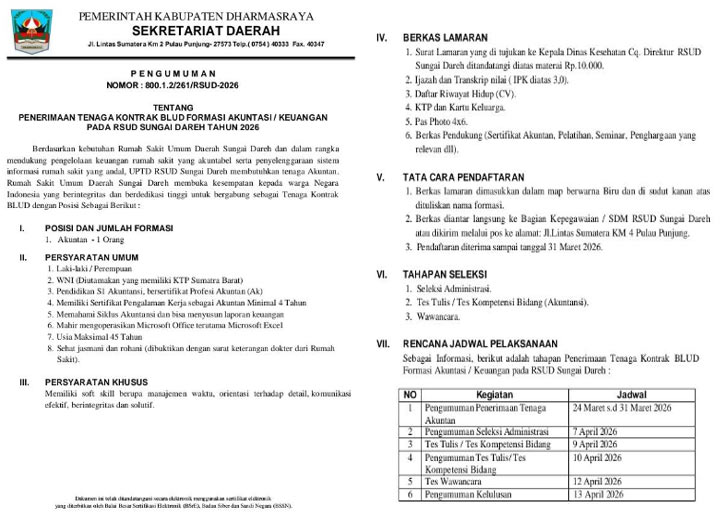 metropadang.com – Pemerintah Kabupaten Dharmasraya melalui RSUD Sungai Dareh resmi membuka penerimaan Tenaga Kontrak Badan Layanan Umum Daerah (BLUD) untuk formasi Akuntansi/Keuangan tahun 2026. Pengumuman ini tertuang dalam surat Sekretariat Daerah Kabupaten Dharmasraya Nomor 800.1.2/261/RSUD-2026 tertanggal 24 Maret 2026.