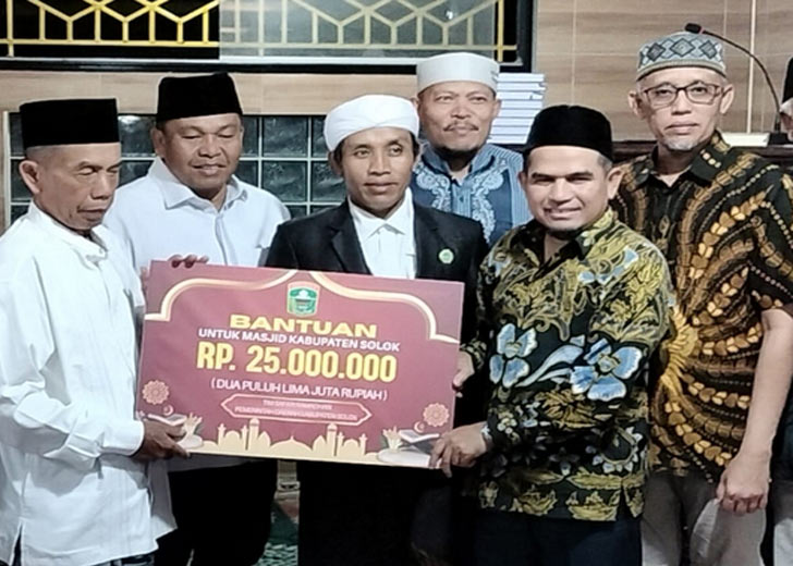 Dalam kegiatan tersebut, Tim Safari Ramadhan Pemerintah Kabupaten Solok juga menyerahkan bantuan untuk Masjid Darul Hikmah sebesar Rp25 juta. (diskominfo)
