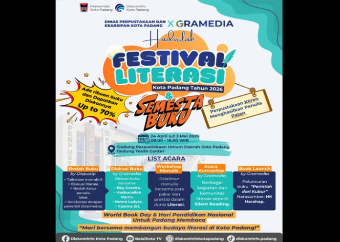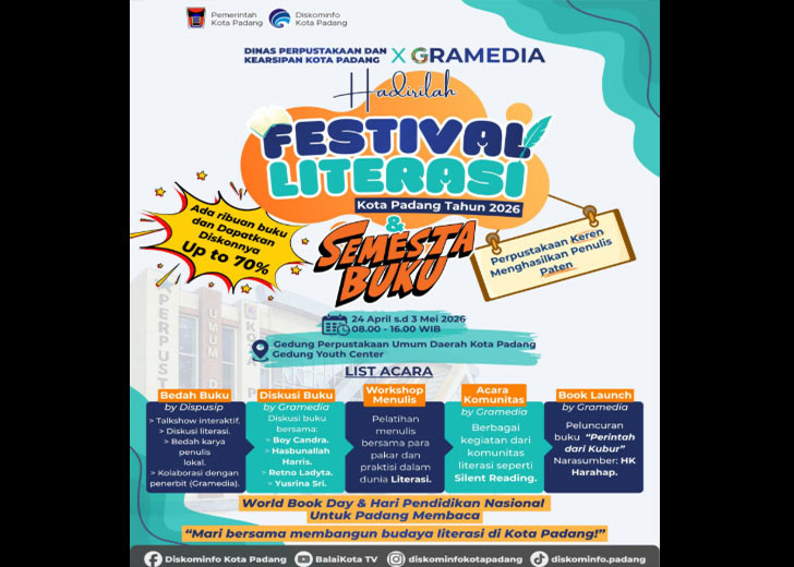 Dinas Perpustakaan dan Kearsipan Kota Padang bekerja sama dengan Gramedia menghadirkan Festival Literasi Kota Padang 2026 bertajuk “Semesta Buku untuk Padang Membaca”. Kegiatan ini menjadi wadah untuk mendorong minat baca sekaligus memperkuat budaya literasi di tengah masyarakat.
