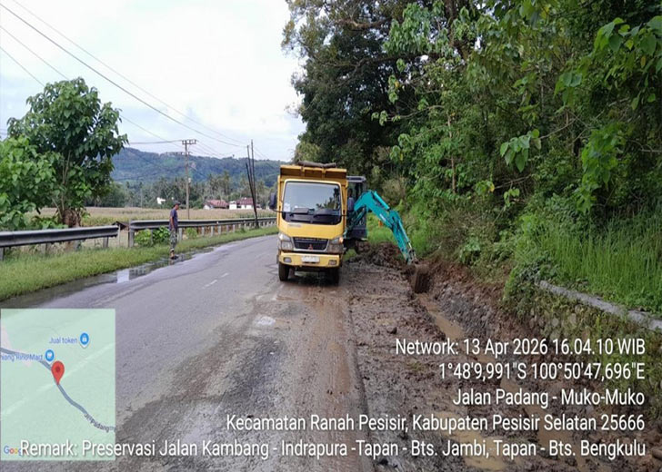 Metropadang.com – Paket preservasi jalan nasional ruas Kambang–Indrapura–Tapan hingga batas Bengkulu resmi mulai dilaksanakan sejak pertengahan Maret 2026. Kegiatan ini merupakan bagian dari program kerja PJN II melalui PPK 2.4 untuk menjaga kemantapan jalan nasional di wilayah tersebut.