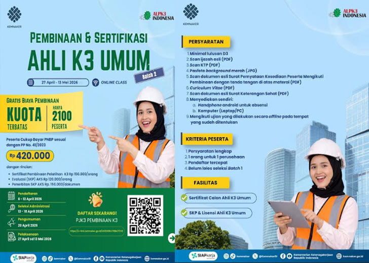 Jakarta — Setelah sukses menyelenggarakan batch I, Kementerian Ketenagakerjaan (Kemnaker) kembali membuka program Pembinaan dan Sertifikasi Ahli Keselamatan dan Kesehatan Kerja (K3) Umum Batch 2 dengan kuota 2.100 peserta dari seluruh Indonesia. Pendaftaran dibuka pada 6–12 April 2026.